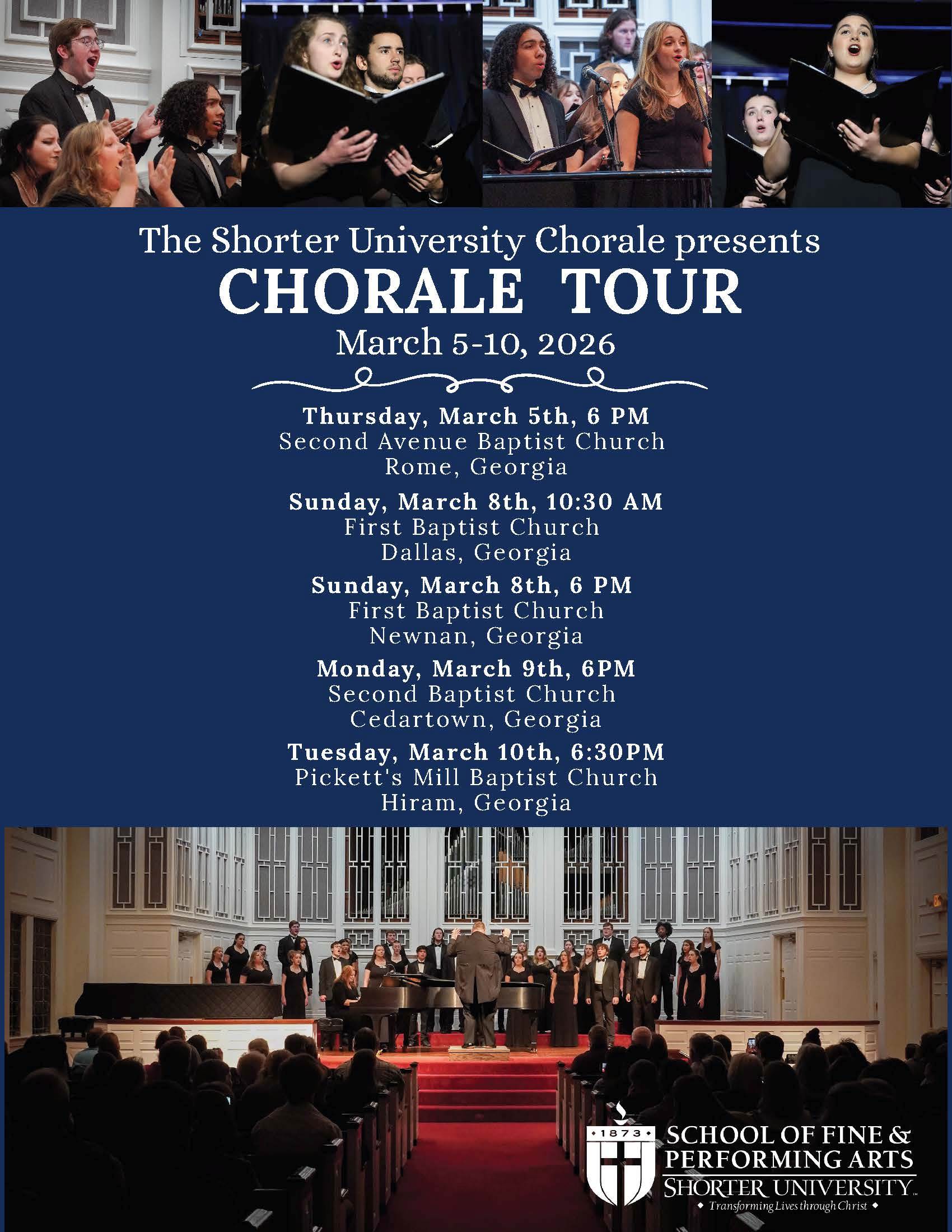 We are excited to gather for the Shorter University Chorale concert at Second Baptist Church of Cedartown (152 Evergreen Ln. Cedartown, GA 30125) on Monday, March 9 at 6 PM, and we would love for you to be part of this special evening.